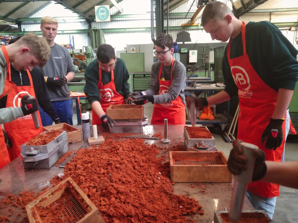 Die Schüler des 9er Technikkurses trafen sich am 10.9. und 17.9 bei unserem Kooperationspartner M.Busch in Wehrstapel. Dort versuchten sie sich als Gießeremechaniker. Am Vormittag stellten sie erst die Sandform für ihre Gussarbeiten her. Der Sand musste dafür ganz fein in die Form gesiebt werden und anschließend gleichmäßig verdichtet werden. Das musste mehrfach wiederholt werden, bis die Form komplett gefüllt war. Anschließend entfernten die Schüler die Vorlage und gossen aus flüssigem Zinn eine Medaille. Ausnahmslos alle habe sehr gute Ergebnisse erzielt. Im Anschluss an die Mitmachgießerei konnte sich die Gruppe über die Arbeit bei M.Busch während eines Betriebrundgangs informieren.